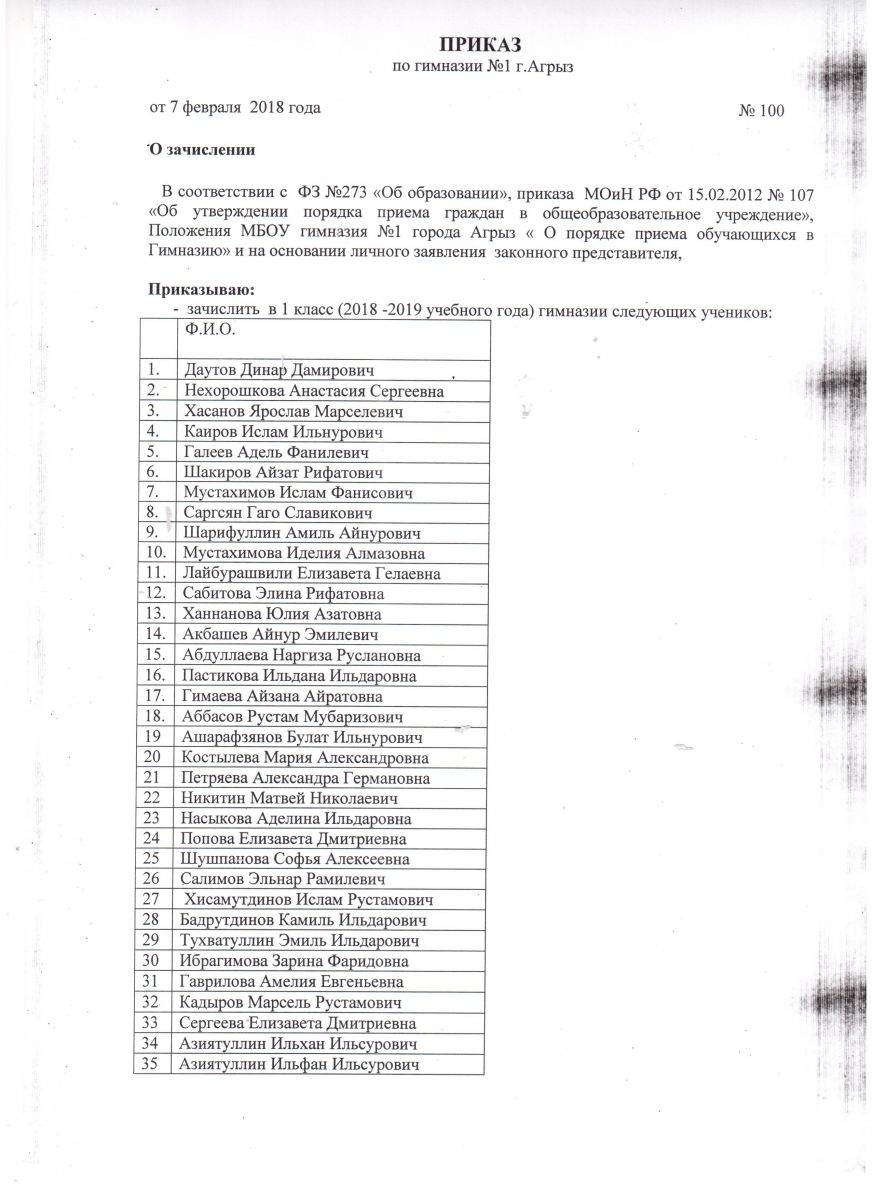 Приказ о Зачислении в первый класс от 7 февраля 2018 года (продолжение)