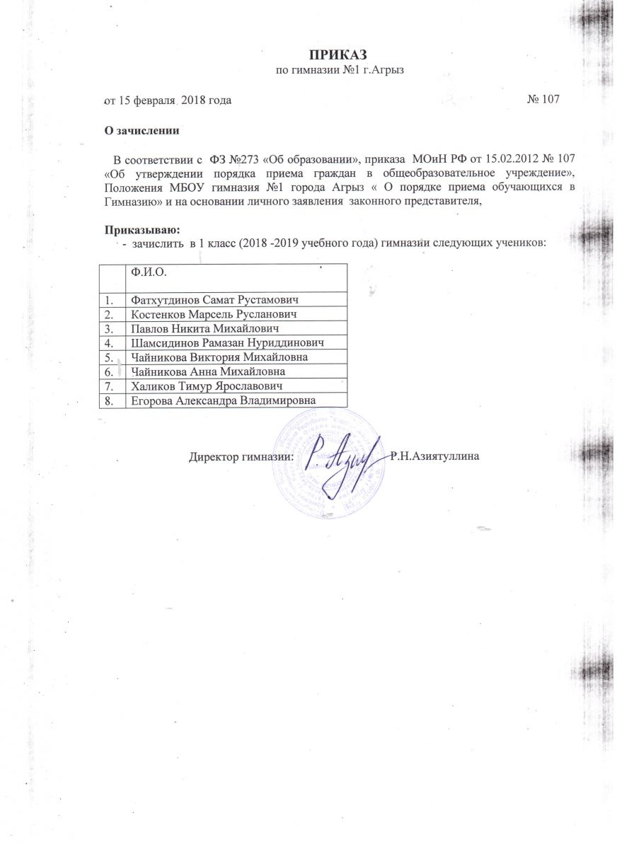 Приказ о Зачислении в первый класс от 7 февраля 2018 года