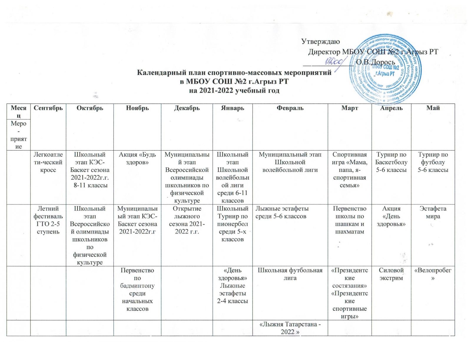 Календарный план спортиавно-массовых мероприятий в МБОУ СОШ № 2