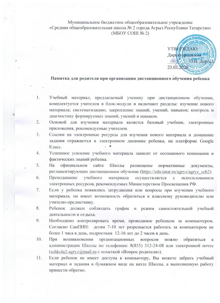 Памятка для родителей при органцации дистанционного обучеия ребенка