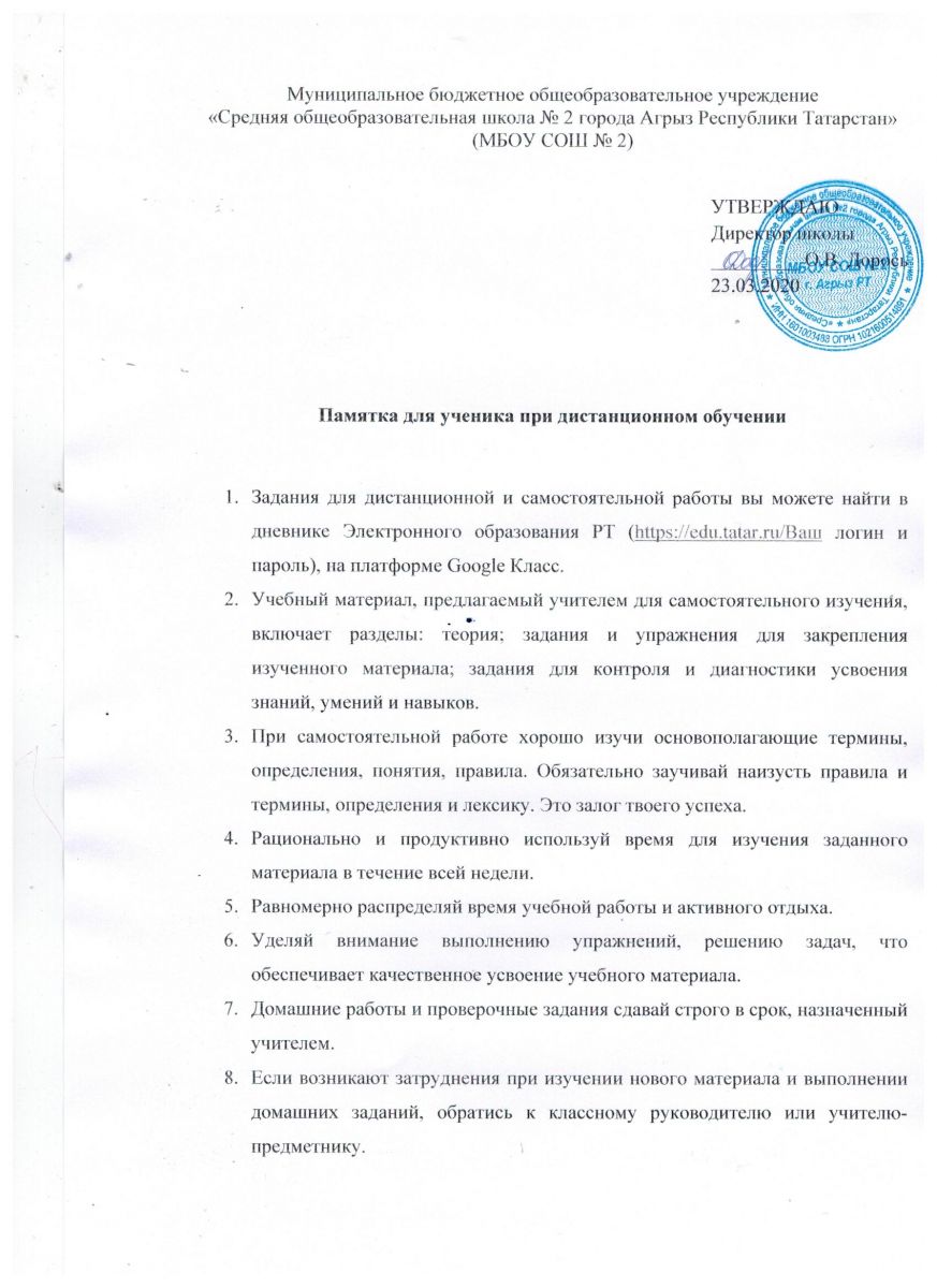 Памятка для ученика при дистанционном обучении