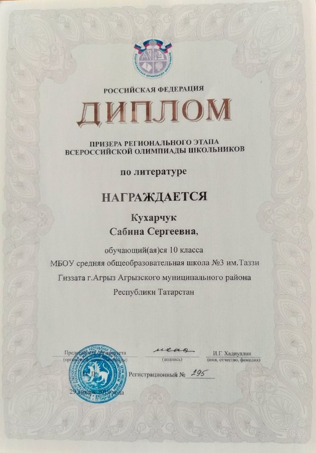 на региональном этапе Всероссийской олимпиады школьников по русской литературе в г.Казань ученица 10 класса Кухарчук Сабина достойно защитила честь школы /3 имени Тази Гиззата г.Агрыз и честь всего района, став ПРИЗЕРОМ данной олимпиады! Так держать, САБИНА,ты - МОЛОДЕЦ! Удачи тебе и впредь!