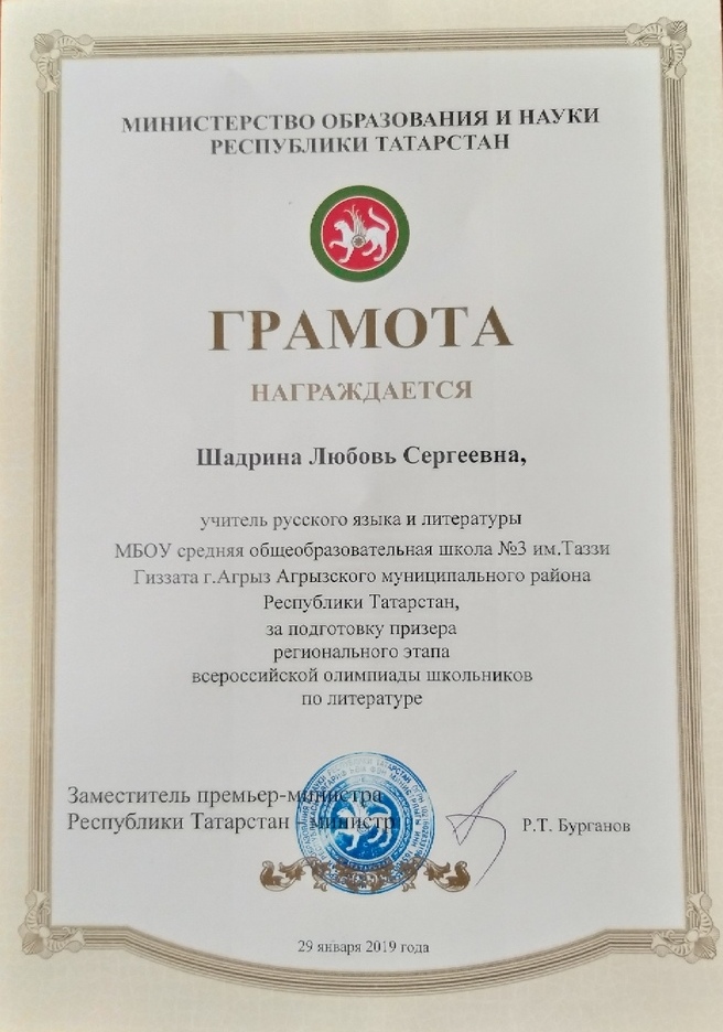 Огромные слова БЛАГОДАРНОСТИ учительнице русского языка и литературы ШАДРИНОЙ ЛЮБОВЬ СЕРГЕЕВНЕ, подготовившей ученицу к олимпиаде! Спасибо Вам за плодотворную результативную работу!