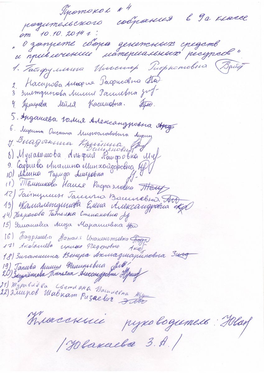 Выписка из протокола родительского собрания в 9 а классе. Классный руководитель Ювакаева З.А.