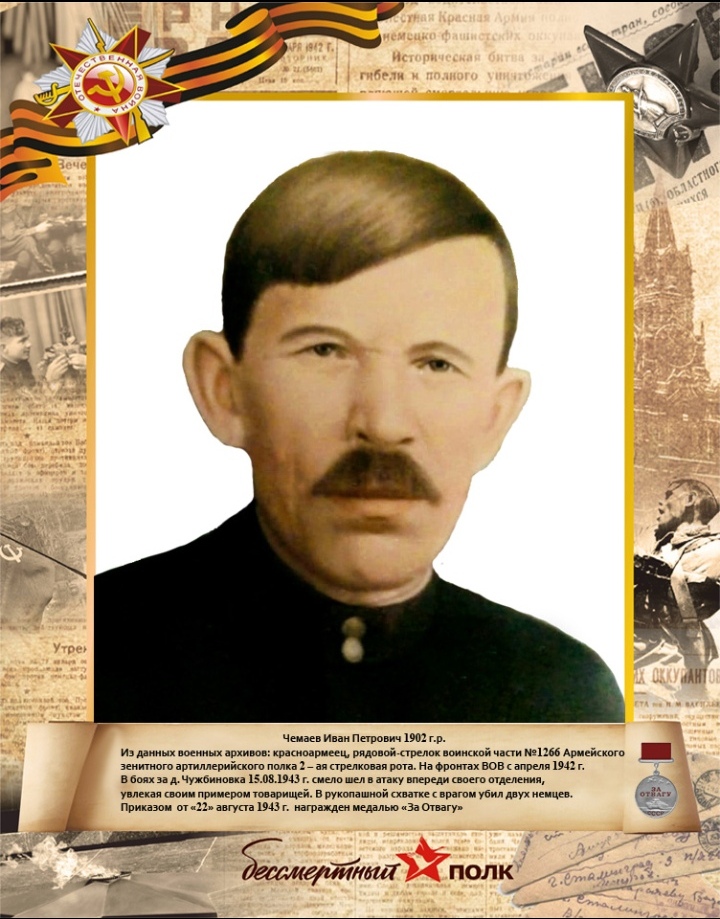 Чемаев Иван Петрович (1902 г.р.) - рядовой, стрелок воинской части №1266Армейского зенитного артиллерийского полка 2-ая стрелковая рота.