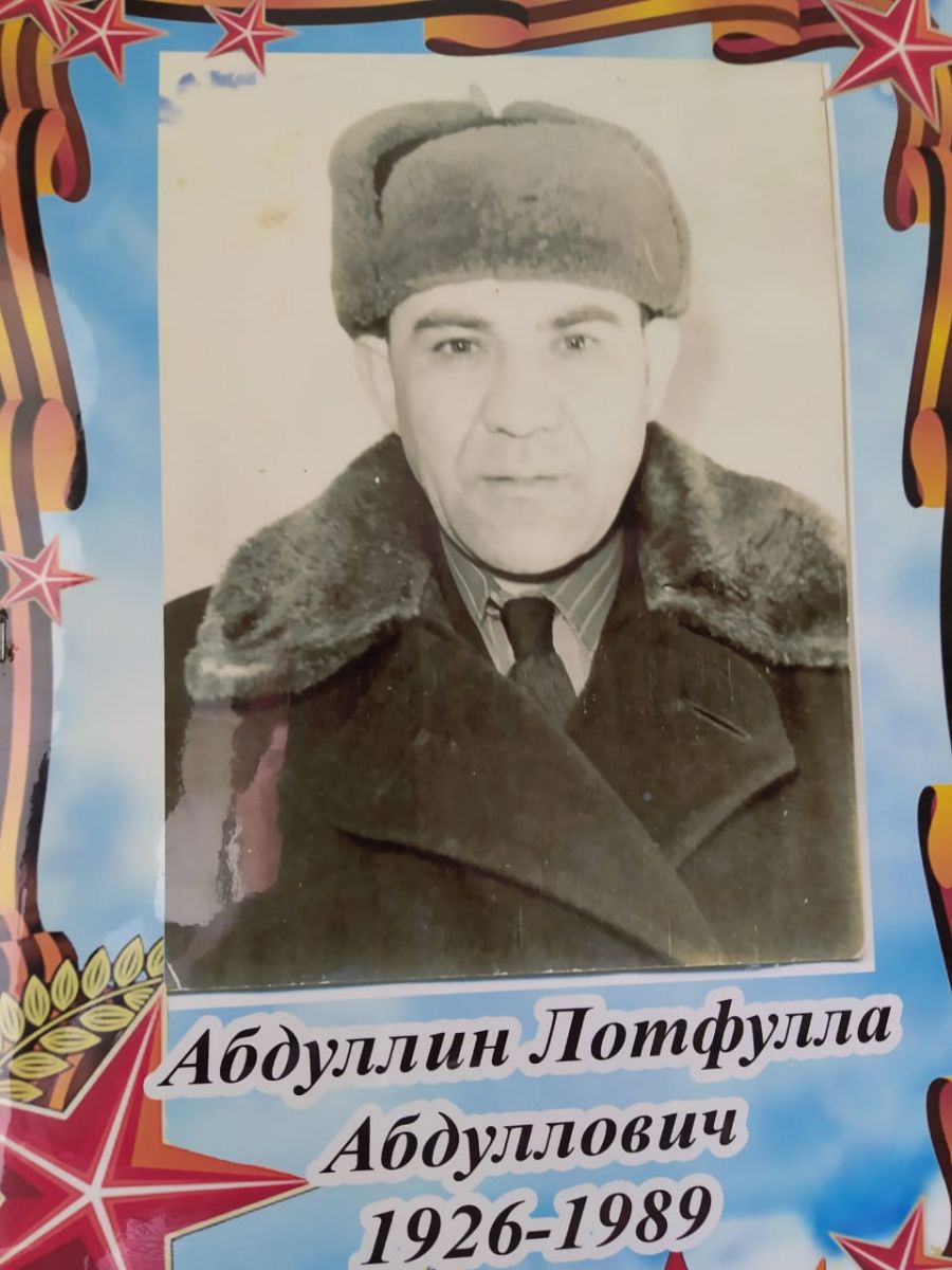 Абдуллин Лотфулла Абдуллович (1926-1989) - Он был учителем математики до войны, после войны директором сельской школы.На войне был командиром бригады самоходных артил-х установок (САУ) В 1943 году добровольно призвался в 1й Украинский фронт.Участвовал в освобождении Украины. После окончания Вов участвовал в Японской войне.Вернулся только 1948 году.Награжден орденами и медалями.