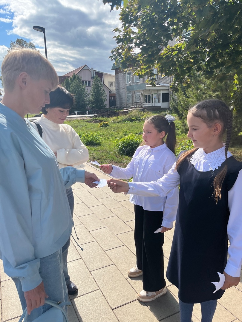 Учащиеся нашей школы вырезали из бумаги белых голубей и раздали жителям нашего города.