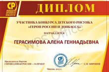 Партия СПРАВЕДЛИВАЯ РОССИЯ – ЗА ПРАВДУ совместно с журналом «Роман-газета» провела выставку конкурса детского рисунка «Герои России и Донбасса». В этом конкурсе участие приняла ученица 5 а класса Герасимов Алёна.