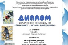 Поздравляем ученицу 3 А класса Гильфанову Диляру - призера республиканского конкурса рисунков "Нашу защиту - жителям дикой природы" в номинации "Водные обитатели", учениц 2 В класса Асылгарееву Софью и Усманову Эмилию - призеров в номинации "Лесные жители". Молодцы!!!