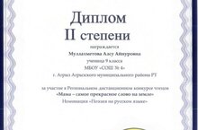 17 ноября прошел региональный конкурс (НГПУ РТ), посвященный празднику "День Матери". Ученица 9а класса Муллахметова Алсу стала призером в номинации "Стихотворение на русском языке".