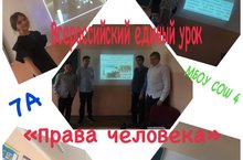 В рамках празднования Международного дня прав человека, МБОУ СОШ 4 города Агрыз принимает активное участие в масштабной образовательной акции - Всероссийский единый урок «Права человека». В честь празднования 75 летия Победы в ВОВ Единый урок был посвящён Году Памяти и Славы. 9.12.2020 г. Учитель истории и обществознания Кахриманова Л. М. Провела урок в 7А классе. Ученики подготовили презентации и видеоролик с фотографиями из семейного архива и интервью с ветеранами ВОВ.
