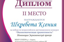 С 20 февраля по 20 марта 2014 года состоялся Всероссийский дистанционный конкурс «Страна Экономика». Шкребета Ксения, ученица 6 А класса, в номинации «Экономический проект» удостоилась 2- го места.