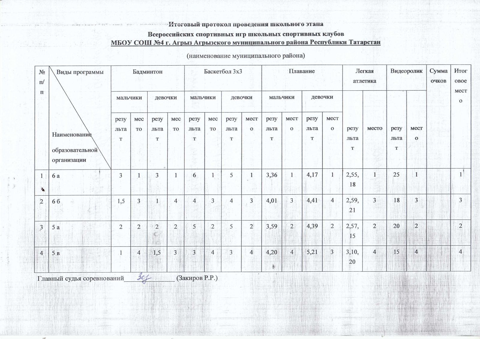 Итоговый протокол школьного этапа Всероссийских спортивных игр школьных спортивных клубов
