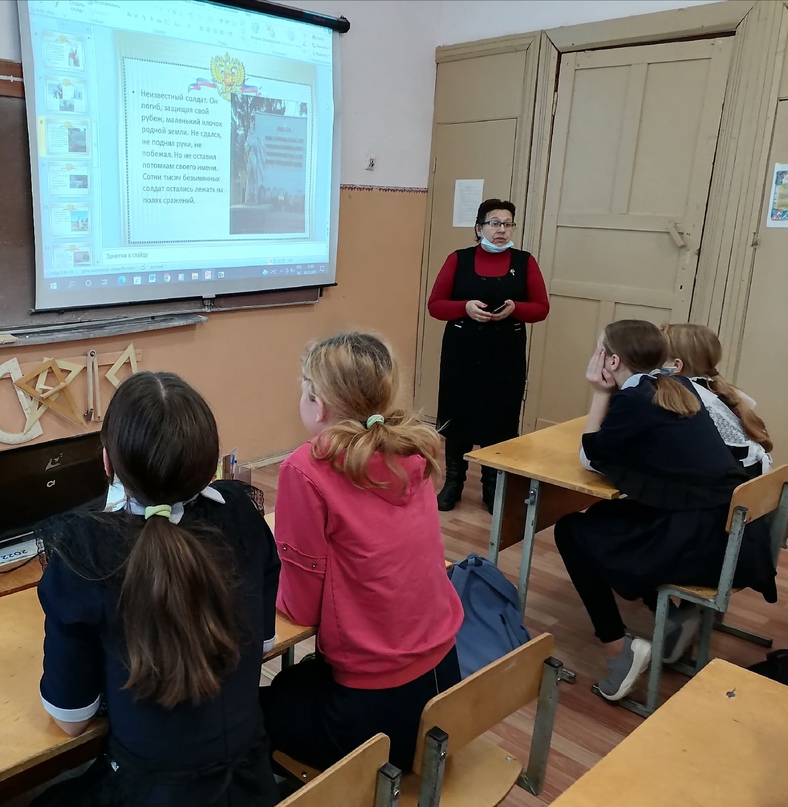 День неизвестного солдата – это сравнительно новая памятная дата в российской истории, отмечается ежегодно – 3 декабря. Этот день призван увековечить память, воинскую доблесть и бессмертный подвиг советских и российских воинов, которые погибли в боевых действиях и чьим имена остались неизвестными. Впервые День неизвестного солдата в нашей стране отметили в 2014 году. Дата 3 декабря была выбрана не случайно. Именно в этот день 3 декабря 1966 года, в ознаменовании 25-й годовщины разгрома немецко-фашистских войск под Москвой, прах неизвестного солдата из братской могилы советских воинов на 41-м километре Ленинградского шоссе (на въезде в город Зеленоград) был перенесен и торжественно захоронен у стены Московского Кремля в Александровском саду. День неизвестного солдата – это не только день памяти погибших в годы Великой Отечественной войны, но и дата, которая объединяет всех погибших и пропавших без вести во время войн и военных конфликтов. В связи с этой памятной датой сегодня в школе было проведено мероприятие,на котором, учитель истории Князева Л.И. ,рассказала о значении дня 3 декабря,затем используя материалы "Книги памяти",ребята вспомнили своих родных погибших во время ВОВ, многие из которых пропали без вести. Затем активисты РДШ, учащиеся 8 класса возложили цветы к памятнику и почтили память погибших минутой молчанья.