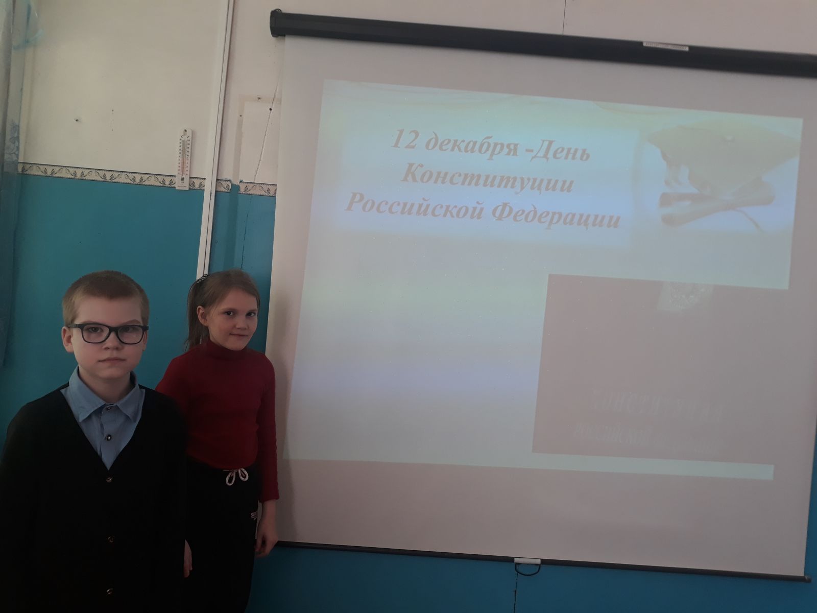 Сегодня в 5 классе проведен классный час "День конституции РФ". Ребята посмотрели презентацию про символы нашего государства: гимн, флаг, герб, Исполнили Гимн РФ. Побеседовали о Конституции РФ, истории ее создания. Узнали об основных правах человека. Используя эти знания, ответили на вопросы викторины: кто нарушал права в детских сказках. Сделали вывод: Конституция- основной закон в Российской Федерации!