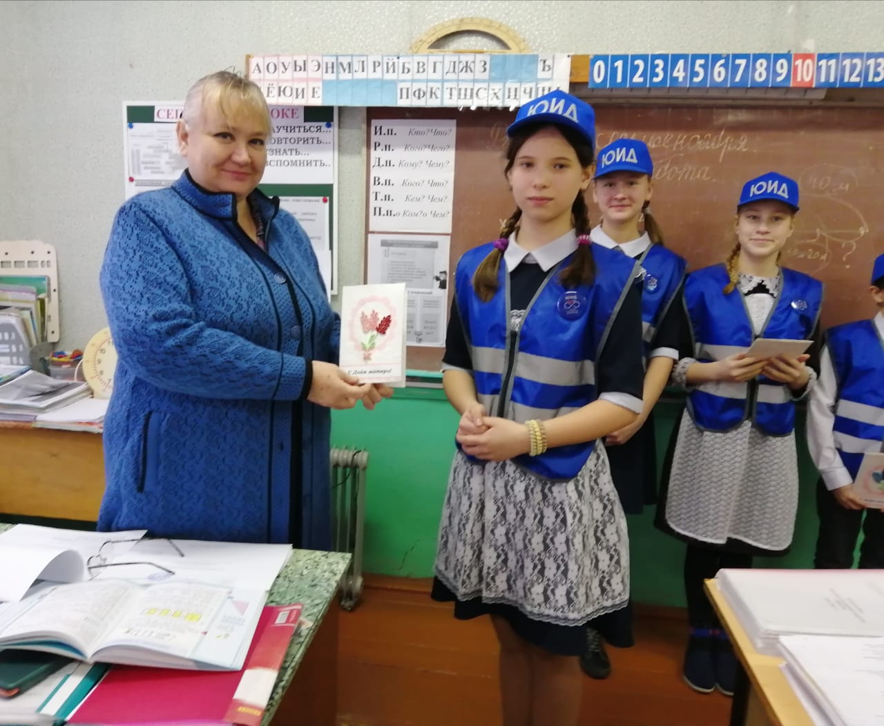 27 ноября отряд ЮИД поздравили учителей-водителей с праздником. Ребята заранее подготовили поздравительные открытки, в которые вложили частичку своей души. С самыми добрыми словами и пожеланиями ребята вручили открытки мамам-водителям, получая в ответ радостные улыбки и слова благодарности.