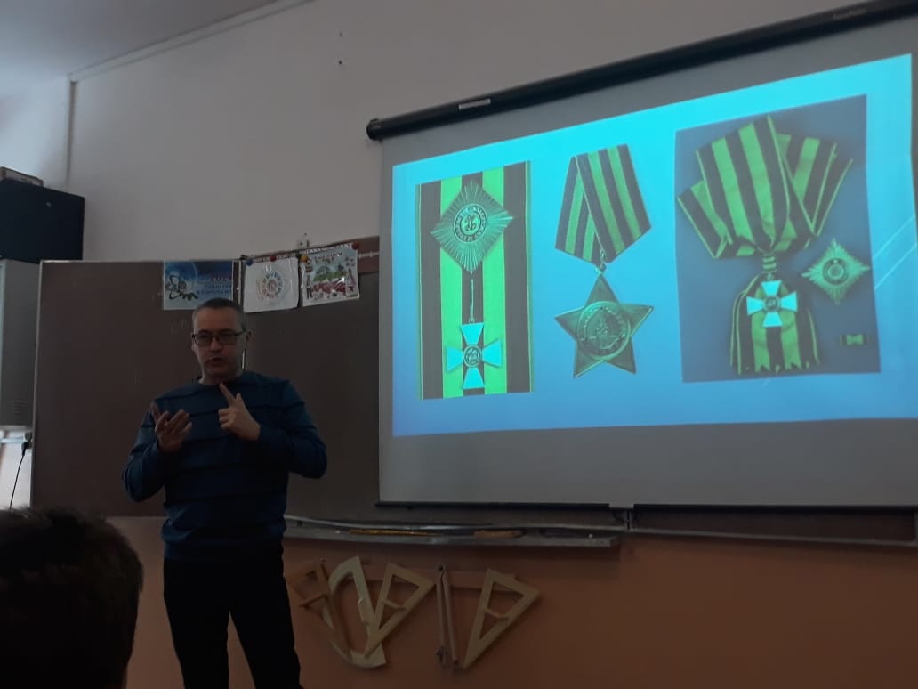 Гурьев В. В. познакомил учащихся школы с историей возникновения ордена Святого Георгия. Учащиеся отряда "Юнармия", рассказали о героях ВОВ.