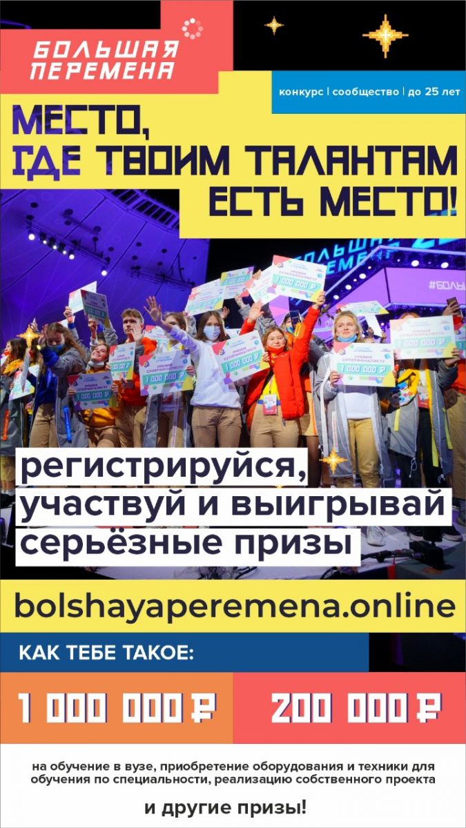 Конкурс "Большая перемена" — место, где твоим талантам есть место! На "Большой перемене" ты найдёшь интересный для тебя вызов! Участвуй в конкурсе "Большая перемена" и получай бомбические призы!