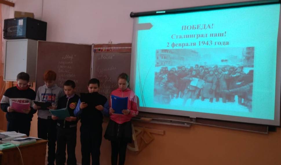 2 февраля отмечается День воинской славы России — День разгрома советскими войсками немецко-фашистских войск в Сталинградской битве. Именно после победы в Сталинградской битве наступил коренной перелом в ходе Великой Отечественной войны. Победа советских войск под Сталинградом имела колоссальное значение для завершения Второй мировой войны. В связи с этой датой в школе были проведены классные часы: ""Главная высота России", "Сталинградская битва","Ни шагу назад!" Также организован просмотр документального фильма "Сталинградская битва", проведена виртуальная экскурсия на Мамаев Курган. Экскурсия по историко-мемориальному комплексу «Героям Сталинградской битвы".Цели проведенных мероприятий: Расширить представление учащихся о Сталинградской битве (17.07.1942г. – 02.02.1943г.), формировать чувство патриотизма, любви к Родине, чувство гордости за свою страну на примере героических поступков людей в годы войны, воспитывать уважительное отношение к старшему поколению, к памятникам войны.