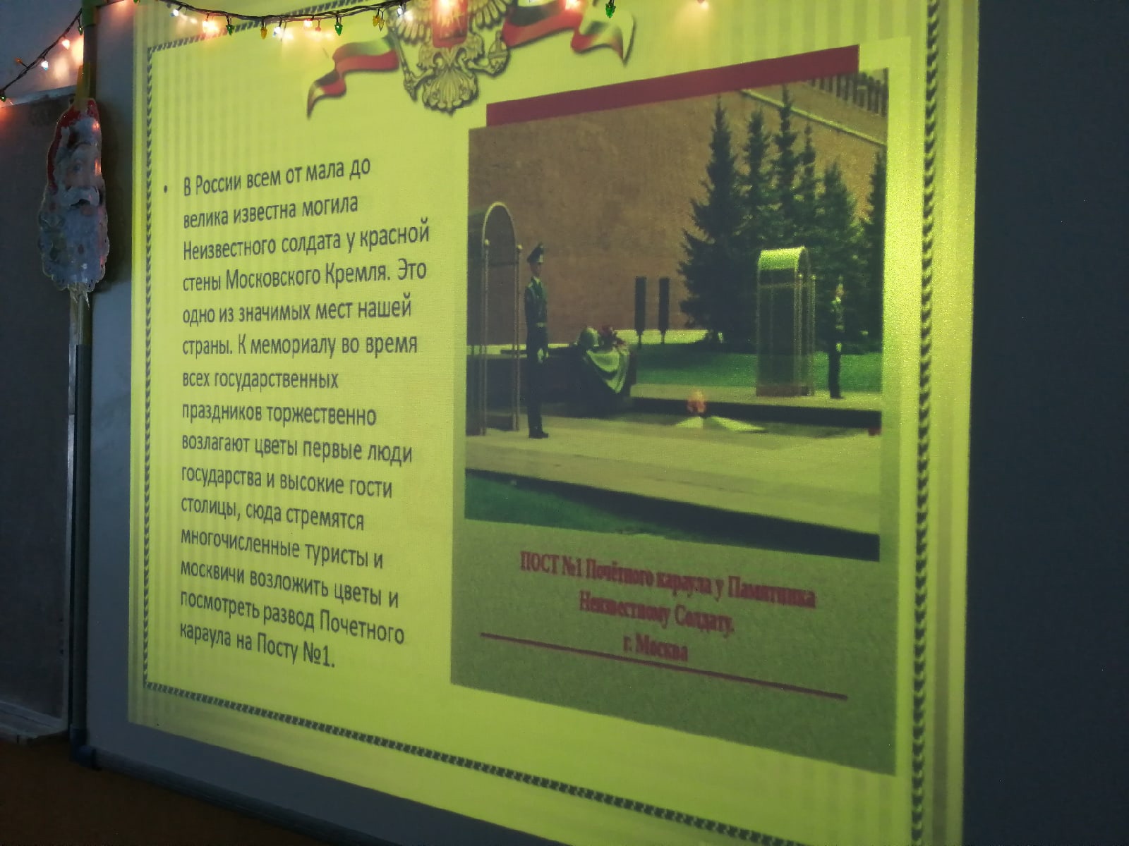Учащиеся Бимской школы провели урок памяти Неизвестного солдата. В классе провели литературно- музыкальную композицию «Имя твое неизвестно, подвиг твой бессмертен», в рамках которого провели конкурс чтецов. В ходе мероприятия по материалам школьного историко-краеведческого музея рассмотрели участников Великой Отечественной войны – уроженцев нашей местности, пропавших без вести. Почтили минутой молчания Память всех участников той страшной войны, ведь до настоящего времени в нашей местности никто не дожил.