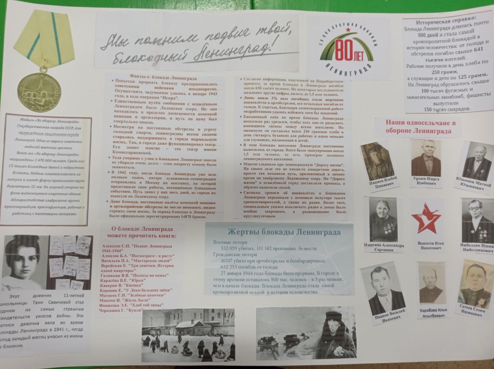 Опубликовано: 28.01.2023В течение всей недели в Бимской школе вспоминали великий подвиг жителей и защитников Ленинграда в годы Великой Отечественной.Оборона Ленинграда навсегда вписана в историю России как невероятно трагическое и в то же время героическое событие. Осада Северной столицы продолжалась с 8 сентября 1941 года и длилась 872 дня. По официальным данным, блокада унесла жизни более 630 тыс. ленинградцев, хотя, по подсчетам историков, эта цифра может достигать и 800 тыс.