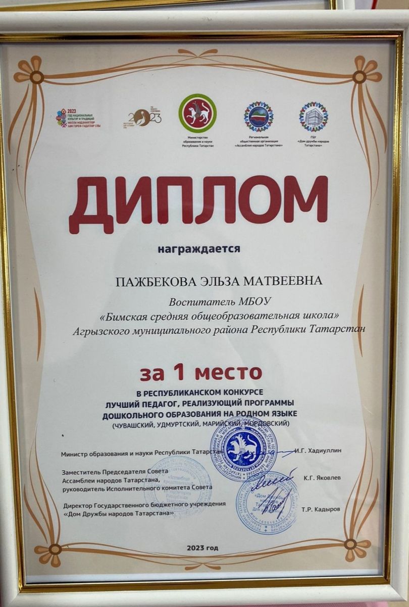 Опубликовано: 24.11.202323 и 24 ноября в г. Казань в Доме дружбы народов прошел конкурс "Лучший воспитатель, реализующий программы дошкольного образования на родном языке (чувашский, удмуртский, марийский, мордовский)". По результатам конкурса Пажбекова Эльза Матвеевна воспитатель МБОУ Бимская СОШ (дошкольная группа) заняла 1 место! Поздравляем!!! Желаем творческих успехов