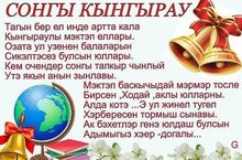 Кадерле укучылар! Сезне соңгы кыңгырау бәйрәме белән котлыйбыз. Мәктәптә алган белемнәрегез сезгә хыялларыгызны тормышка ашырырга, алда торган житди сынауларны унышлы тапшырырга ярдәм итсен. Яшьлек дәрте, канатлы теләкләрегез сезне алга әйдэп торсын. Кайда гына белем алсагыз да, нинди генә унышларга, дәрәжәләргә ирешсәгез дә, чишмә башыгызны: туган авылыгызны, белем йортыгызны, укытучыларыгызны, дусларыгызны, узегезне тәрбиялэп устергән әти- әнилэрегезне онытмагыз. КЕШЕ булып калыгыз. Хэерле сәгатьтә, ак юллар сезгә! Мәктәп администрациясе.