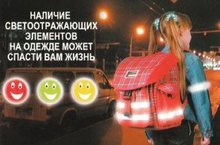Что касается детей-пешеходов, то, каждый тринадцатый пострадавший в ДТП - это по-прежнему ребенок.В тех странах, где использование светоотражающих элементов на детской одежде введено в обязательном порядке, детский травматизм на дорогах снизился в 6 — 8 раз. Это очень важное достижение, ведь фликер — не просто блестящий значок, делающий пешехода заметным. Он формирует определенную психологию, призывающую человека быть осторожным. Обращайте внимание не только на знание Правил дорожного движения. Цвет одежды влияет на безопасность. Для пешехода очень важно быть «видимым». И не все родители это понимают, выбирая «практичные» темные тона. А ведь это делает пешехода практически незаметным, особенно в пасмурную погоду, в сумерки. И большинство наездов транспорта на пешеходов происходят именно из-за плохой видимости пеших людей. Это особенно часто случается на плохо освещенных улицах городов, пригородов, вне населенных пунктов. Нередко случаи, когда из-за действий такого пешехода-невидимки, происходят столкновения транспорта или наезды его на различные препятствия. Многие производители детской одежды заботятся не только о красоте и удобстве своей продукции, но и безопасности юного пешехода, используя светоотражающие элементы: рисунки на куртках, вставные полоски и т.д. При выборе следует отдать предпочтение именно таким моделям. При отсутствии специальной одежды необходимо приобрести другие формы светоотражающих элементов, которые могут быть размещены на сумках, куртке или других предметах. Такими же элементами безопасности следует оснастить санки, коляски, велосипеды. Применение световозвращателей (катафотов) пешеходами более чем в 6,5 раз снижает риск наезда транспортного средства на пешехода в темное время суток. При движении с ближним светом фар водитель замечает пешехода со световозвращающим элементом с расстояния 130–140 метров, когда без него – в лучшем случае с расстояния 25–40 метров. При движении с дальним светом он заметит пешехода на расстоянии до 400 метров.