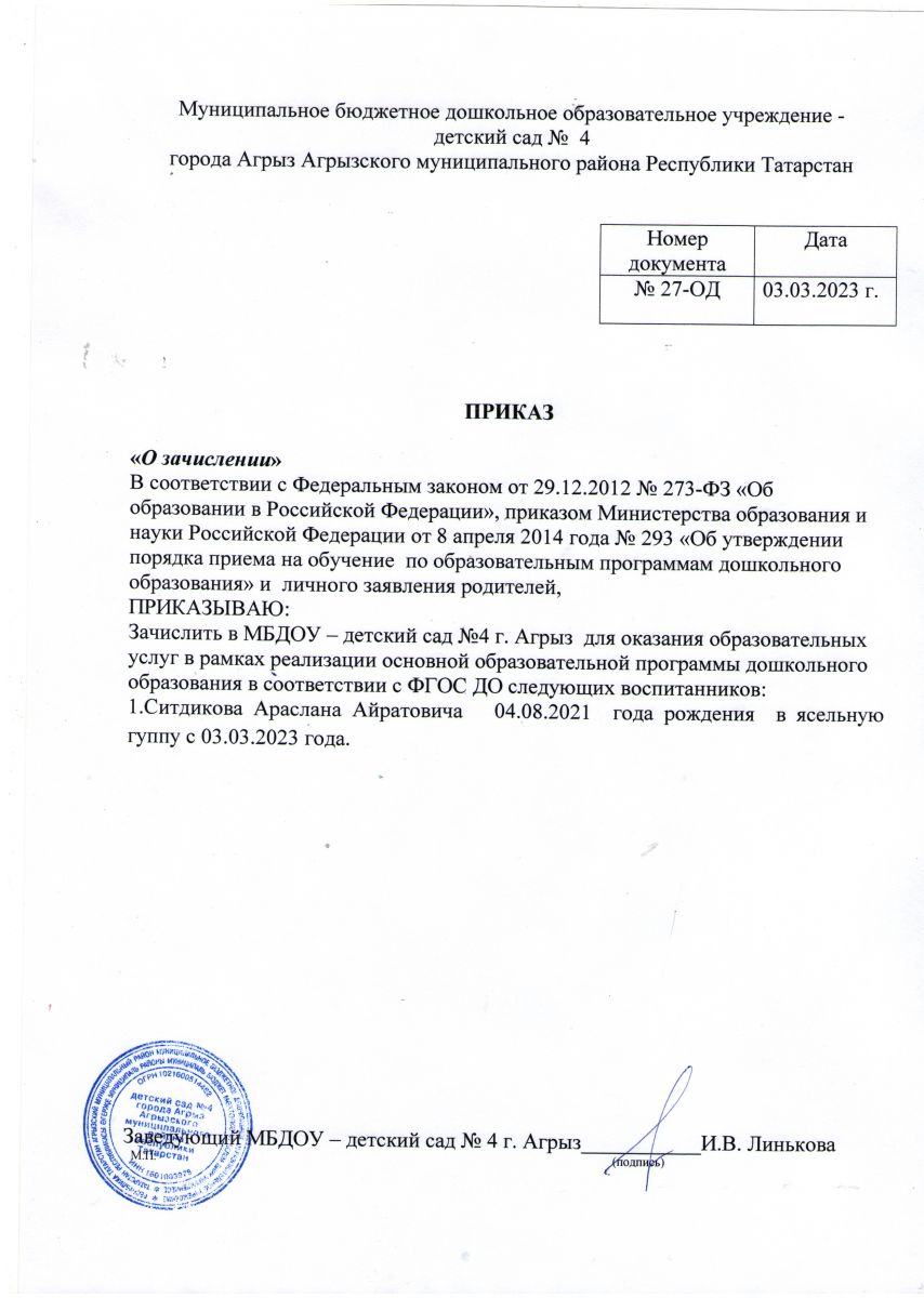 Приказ "О зачислении" 27-ОД от 03.03.2023