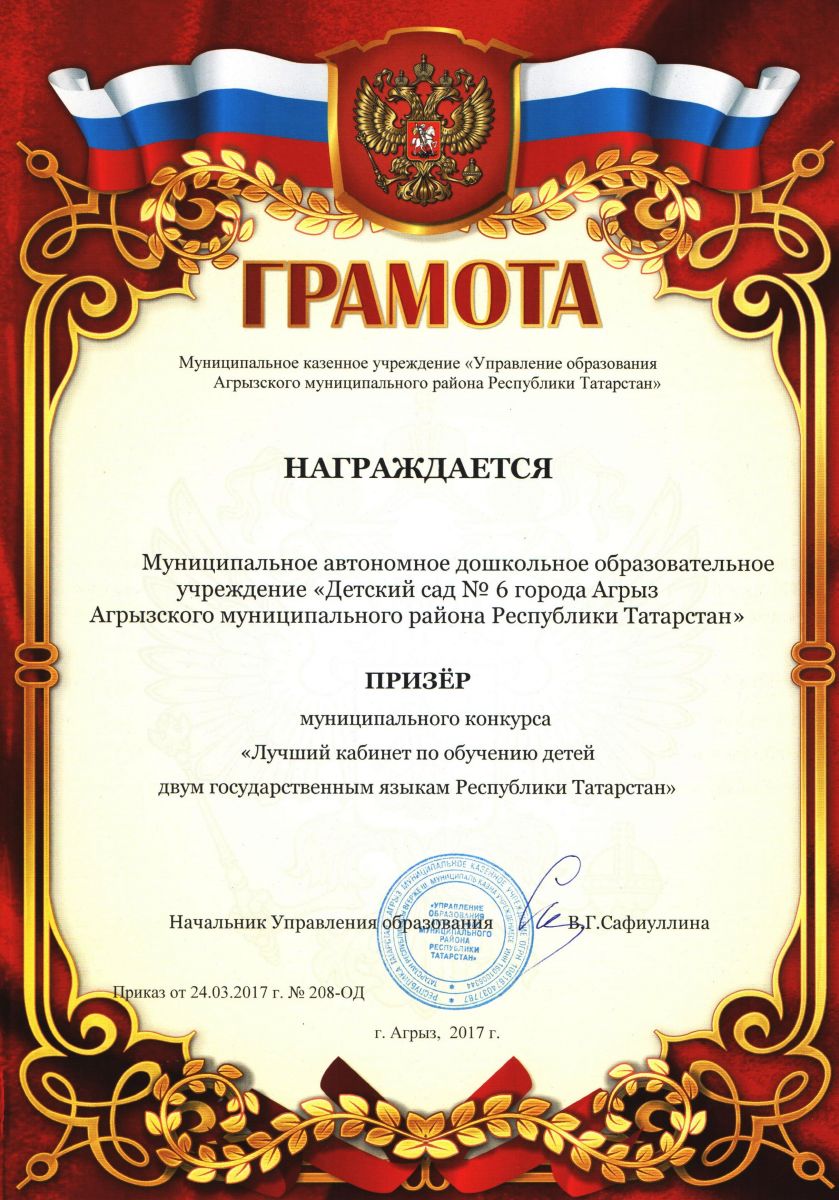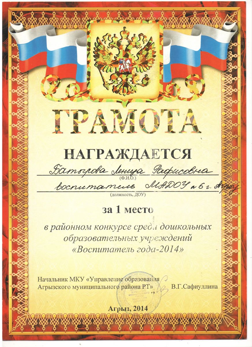 4. Грамота Батыровой Л.Р. за победу в районном конкурсе "Воспитатель года 2014"