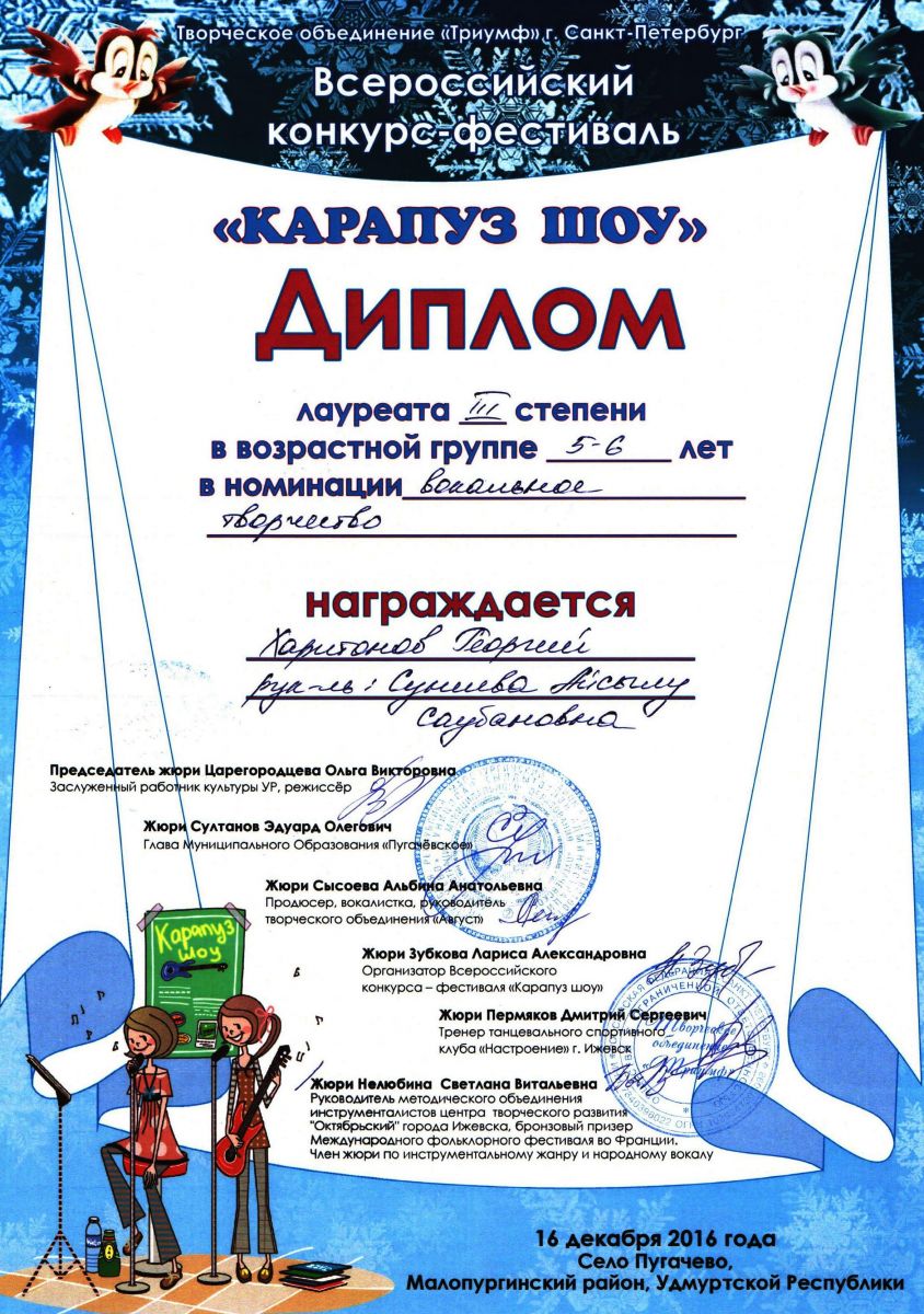 12. Диплом 2 степени во Всероссийском конкурсе-фестивале "Карапуз-шоу" 2016