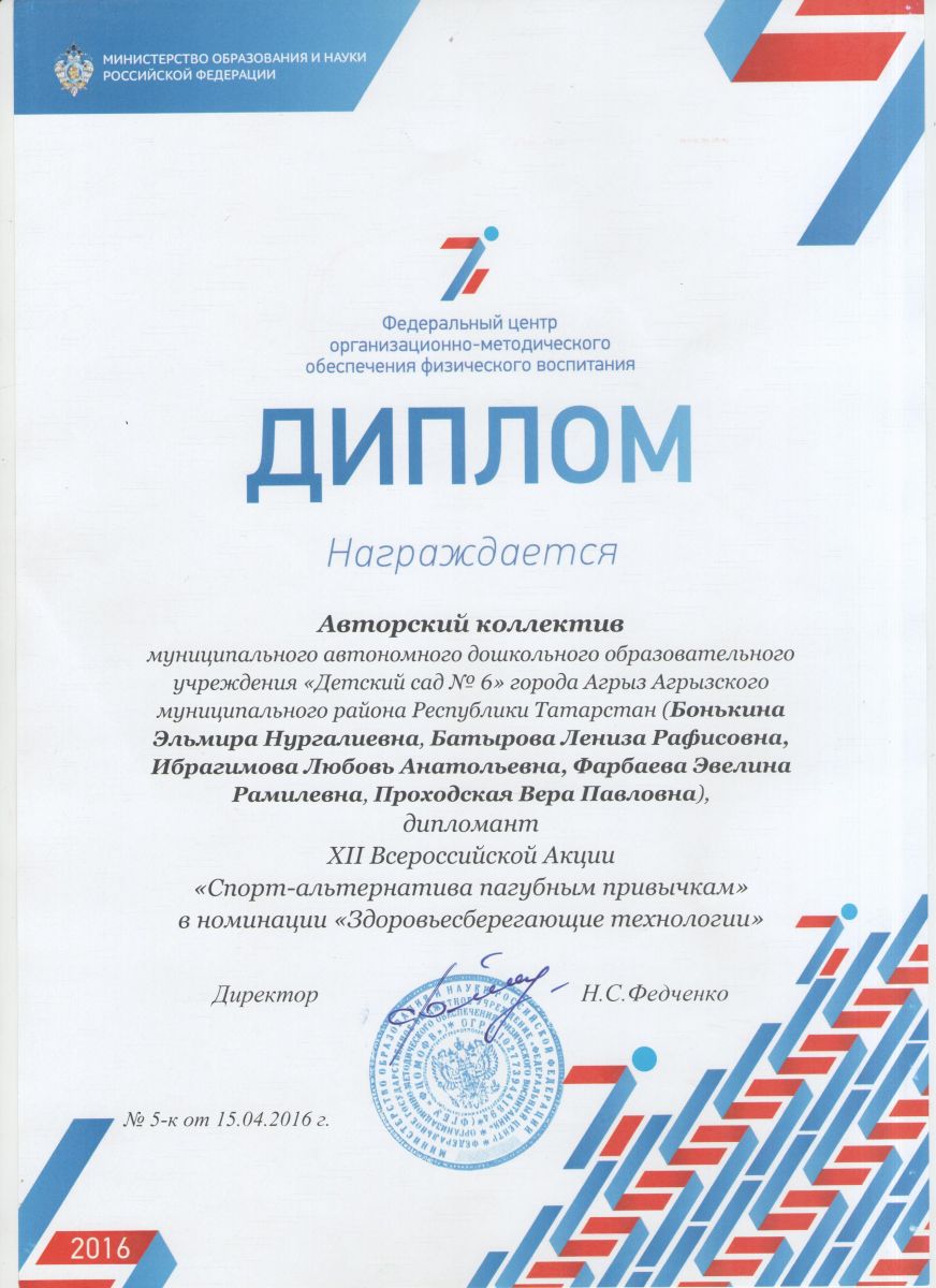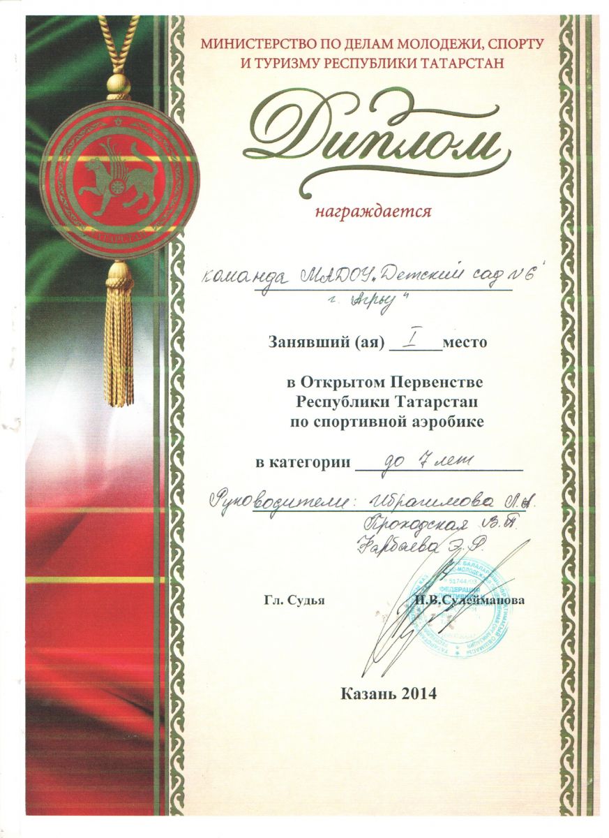 5. Диплом за 1 место команде МАДОУ "Детский сад №6 г.Агрыз" в "Фитнес марафоне" 2014