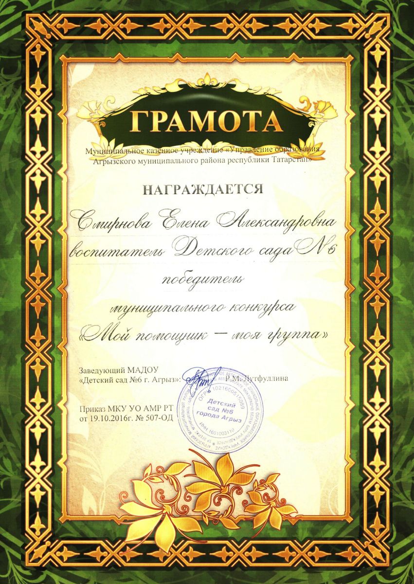 29.Грамота победителя муниципального конкурса "Мой помощник - моя группа", Смирнова Е.А.