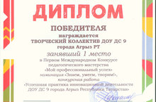 Наш детский сад принял участие в Первом Международном Конкурсе педагогического мастерства "Мой профессиональный успех" в номинации "Знаем, умеем, творим!" и занял 1 место. Поздравляем коллектив и желаем дальнейших побед и успеха во всём!