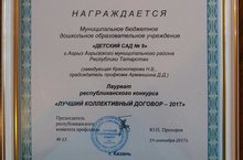 Хотим поздравить коллектив детского сада №9 и поблагодарить заведующего Красноперову Н.Б. и председателя профкома Арманшину Д.Д. за 4 место в республиканском конкурсе "ЛУЧШИЙ КОЛЛЕКТИВНЫЙ ДОГОВОР - 2017".