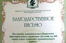 Хочется поздравить заведующего Н.Б. Красноперову и коллектив детского сада с вручением БЛАГОДАРСТВЕННОГО ПИСЬМА от МИНИСТЕРСТВА ЭКОЛОГИИ И ПРИРОДНЫХ РЕСУРСОВ РЕСПУБЛИКИ ТАТАРСТАН за активное участие в природоохранных мероприятиях и большой вклад в воспитании экологической культуры подрастающего поколения Республики Татарстан.