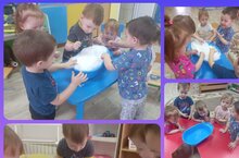 В первой младшей группе прошла опытно-экспериментальная деятельность "Игры с губкой". Дети учились ловить мокрую губку, развивали координационные движения обеих рук.