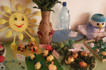 Сегодня, в средней группе , в рамках экологической акции "Сбережем планету!", прошла выставка творческих работ под названием "Изделия из бросового материала".