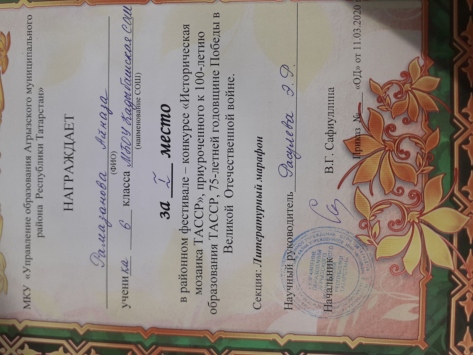 Ученик 6 класса Рамазанов Айназ ( педагог Расулева Э.Р.) принял участие в районном фестиваль - конкурсе " Историческая мозаика ТАССР", приуроченный 100-летию образования ТАССР, 75-летней годовщине Победы в Великой Отечественной войне и занял 1 место в направлении "Литературный марафон". Методические работы педагогов Расулевой Э.Р., Юсуповой Г.С., Тулбаевой А.Р. опубликованы в сборнике разработок педагогов Агрызского района "Историческая мозаика ТАССР".