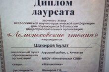 Шакиров Булат "Математика" секциясенең "Ломоносов укулары"гомуми белем бирү учреждениеләренең 5-9 сыйныф укучылары өчен Бөтенроссия фәнни-гамәли конференциясе лауреаты булды. Фәнни җитәкчесе: математика укытучысы Шакирова Г. К.