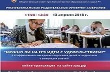 В соответствии с планом работы Министерства образования и науки Республики Татарстан 13 апреля 2018 года с 11.00 до 12.30 состоится пятое заседание Республиканского родительского интернет-собрания на тему: «Можно ли на экзамены идти с удовольствием?». Его модераторами выступят заместитель Премьер-министра Республики Татарстан – министр образования и науки Республики Татарстан Р.Т.Бурганов, заместитель министра образования и науки Республики Татарстан – руководитель департамента надзора и контроля в сфере образования Министерства образования и науки Республики Татарстан Г.З.Габдрахманова.