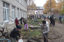На уборку листвы сегодня вышла вся школа. Общими усилиями учеников и учителей листва была убрана очень быстро. Ребята работали дружно и активно. Все молодцы!