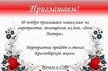 30 ноября в Красноборской школе состоится праздничное мероприятие, посвященное Дню Матери. Приглашаем всех мам и бабушек!