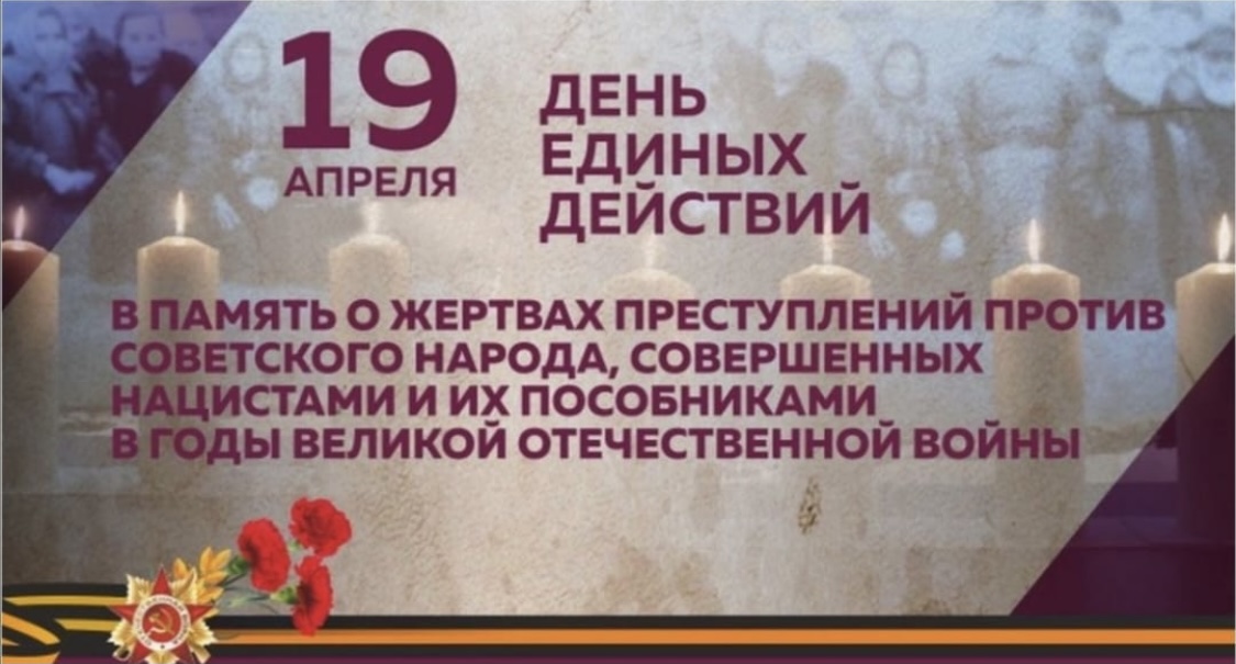 19 апреля страна отмечает день единых действий в память о жертвах преступлений против советского народа, совершенных нацистами и их пособниками в годы Великой Отечественной войны. Целью акции является сохранение исторической правды о преступлениях нацистов в отношении мирных советских граждан в годы войны на оккупированной территории. Действия Красной Армии и единение советского народа в достижении Победы спасли наше государство и его граждан от полного уничтожения.