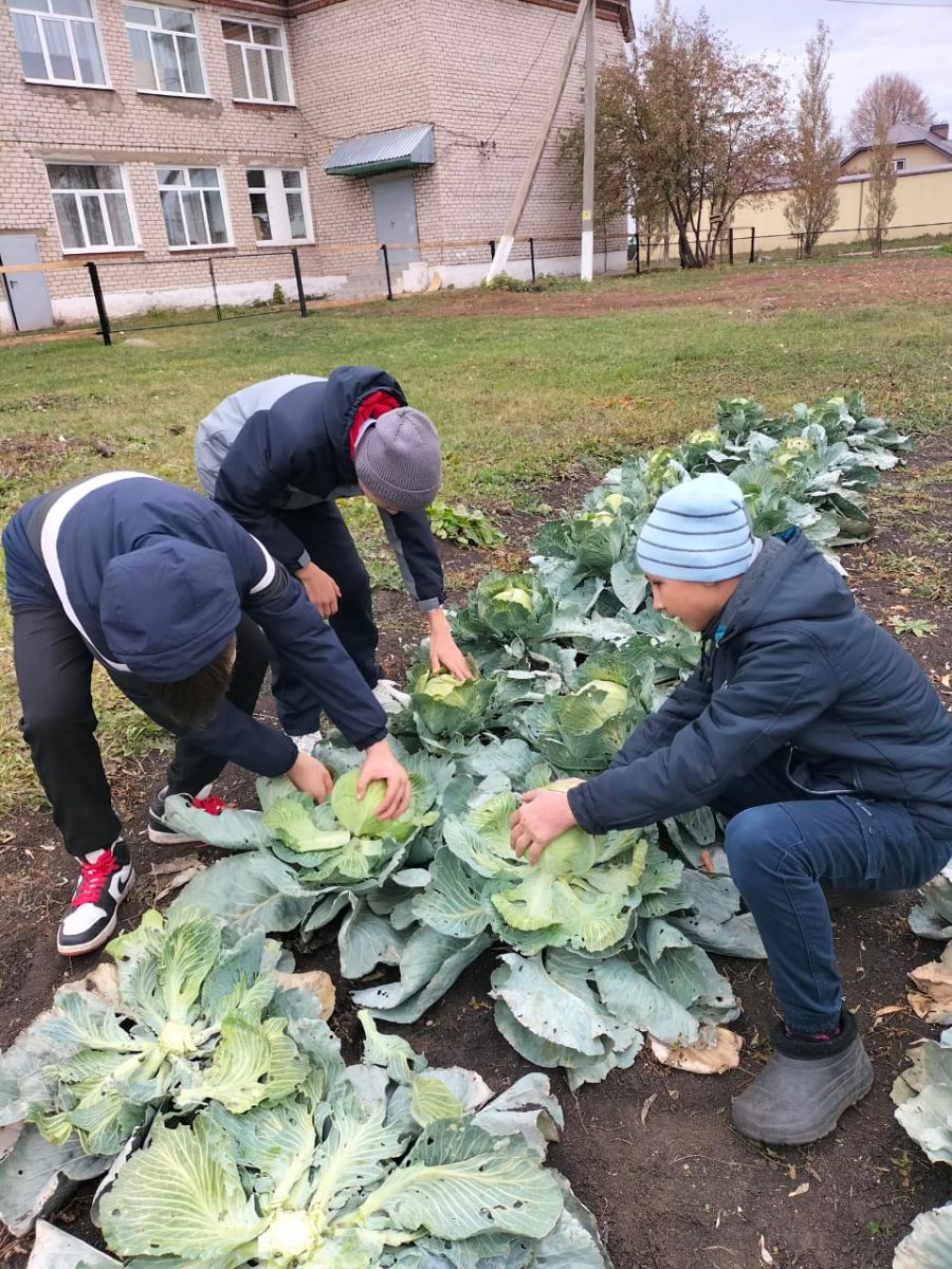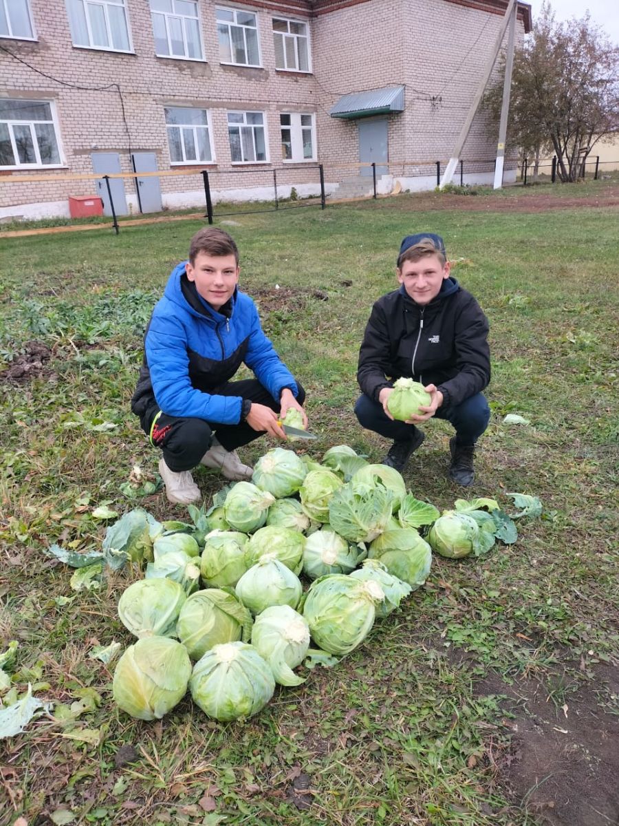 Сегодня на пришкольном участке учащиеся 8 класса убрали капусту. Несмотря на засушливое лето получили хороший урожай капусты.