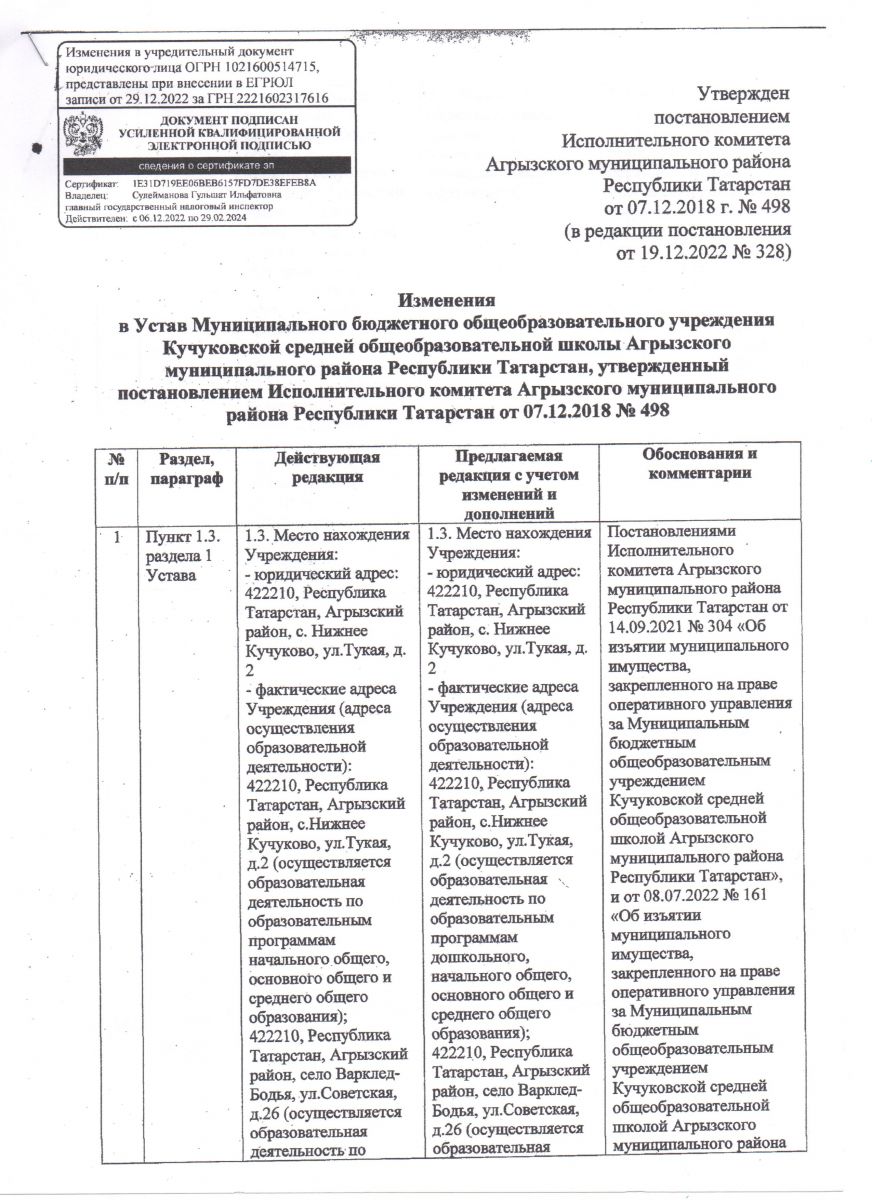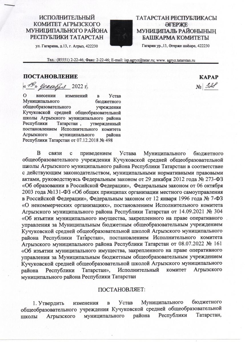 Постановление Исполнительного комитета Агрызского муниципального района Республики Татарстан от 19.12.2022 г. № 328 " О внесении изменений в Устав Муниципального учреждения Кучукковской средней общеобразовательной школы Агрызского муниципального района Республики Татарстан, утвержденный постановлением Исполнительного комитета Агрызского муниципального района Республики Татарстан от 07.12.2018 №м 498 2 лист