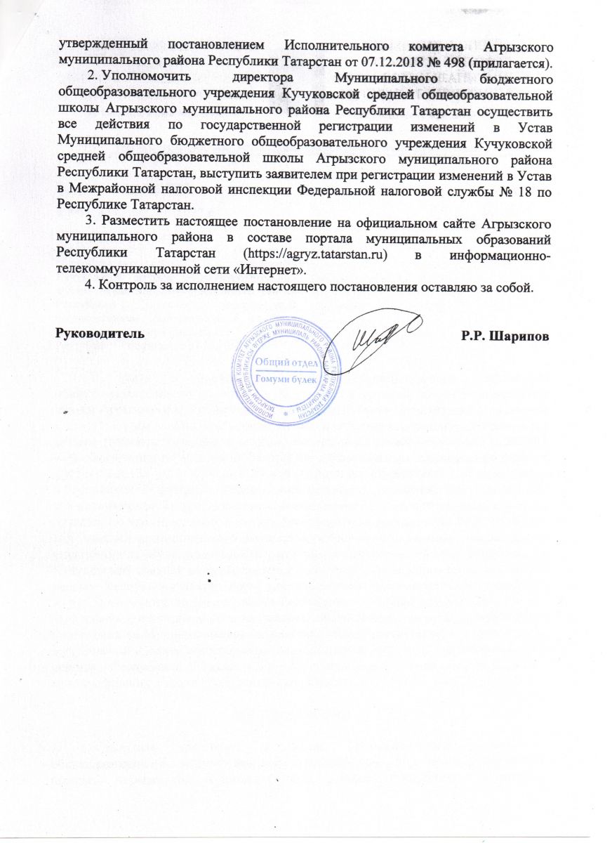 Изменения в в Устав Муниципального учреждения Кучукковской средней общеобразовательной школы Агрызского муниципального района Республики Татарстан, утвержденный постановлением Исполнительного комитета Агрызского муниципального района Республики Татарстан от 07.12.2018 №м 498 2 лист