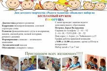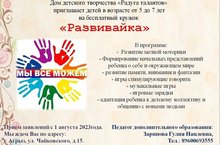 В ДДТ "Радуга талантов" объявляется набор в бесплатный кружок "Говоруша" для детей от 5 до 7 лет. Педагог - Петрова Дарья Валерьевна. Приемная комиссия начинается с 1 августа 2023 года. График работы приёмной комиссии: понедельник-пятница с 8.00 ч до 16.00 ч, 12.00-13.00 ч - обед. При себе иметь следующие документы: - копию свидетельства о рождении, - копию СНИЛС ребенка, - медицинскую справку от педиатра, - фото ребенка 3*4 см 10.08.2023