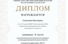 Учащаяся 9 класса МБОУ Кулегашской СОШ Семенова Виктория заняла II место, Муллахметова Гузель учащаяся Терсинской СОШ заняла III место в республиканском творческом конкурсе антикоррупционной направленности "Скажем коррупции "Нет!". Поздравляем!