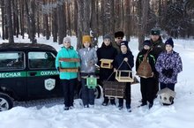 Участники акции повесили кормушки, насыпали корм.